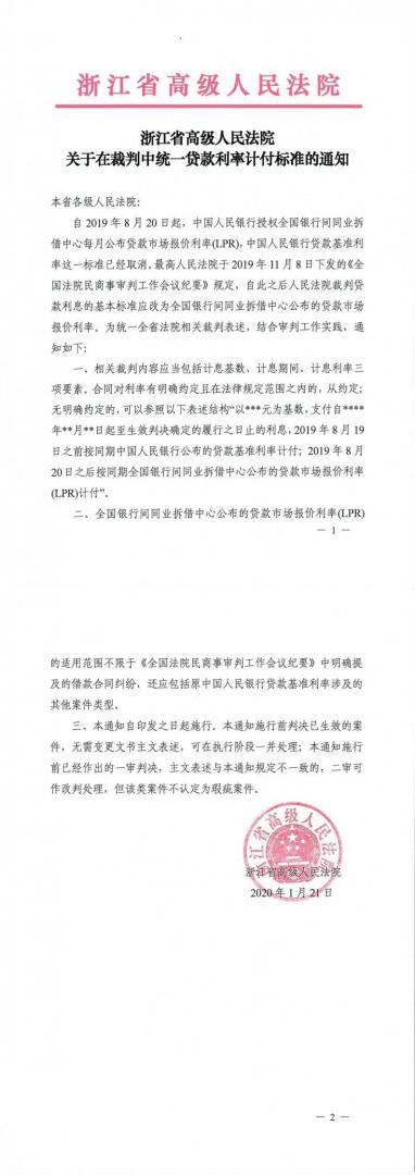 浙江省高级人民法院 关于在裁判中统一贷款利率计付标准的通知